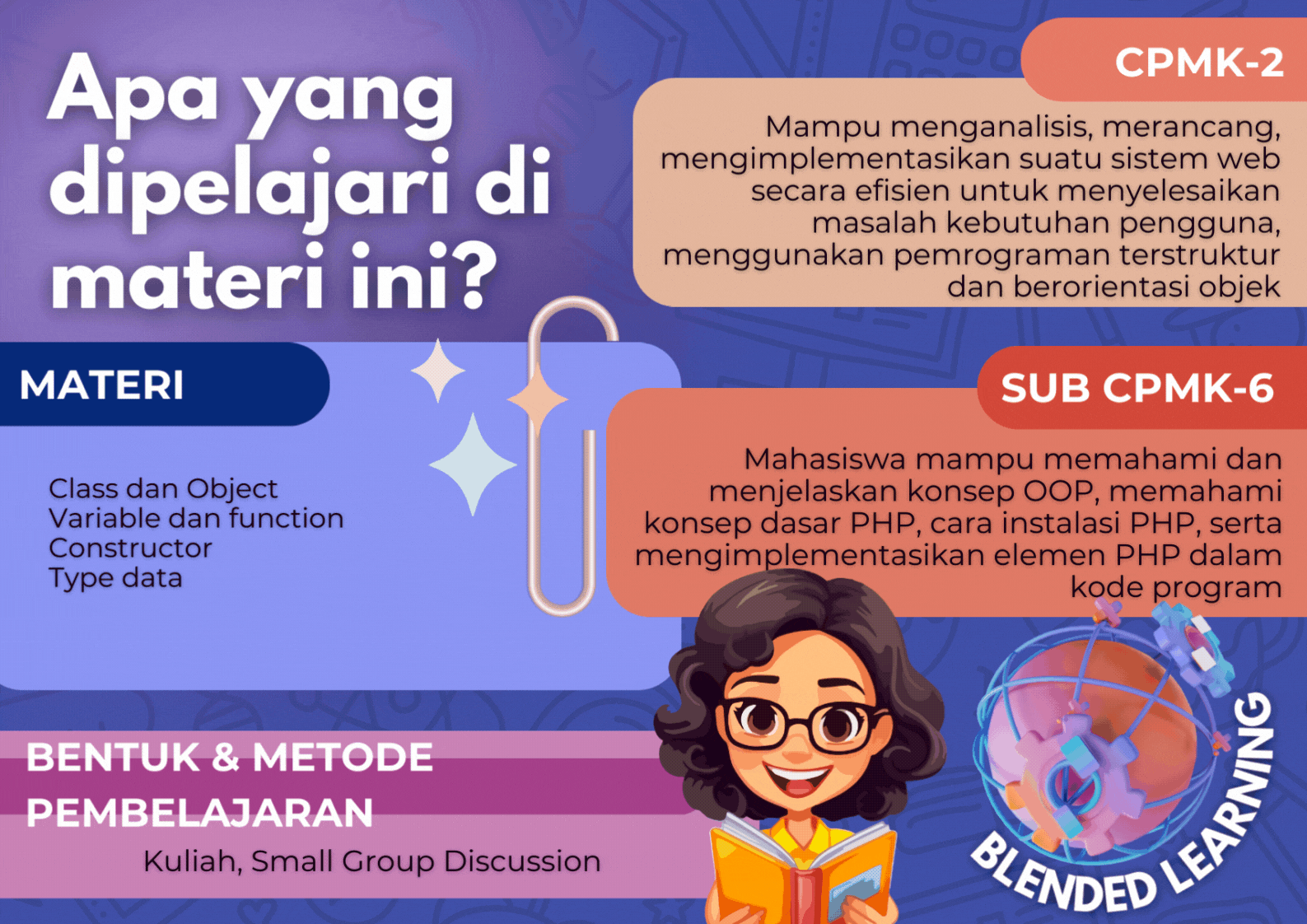 Mahasiswa mampu memahami dan menjelaskan konsep OOP, memahami konsep dasar PHP, cara instalasi PHP, serta mengimplementasikan elemen PHP dalam kode program
