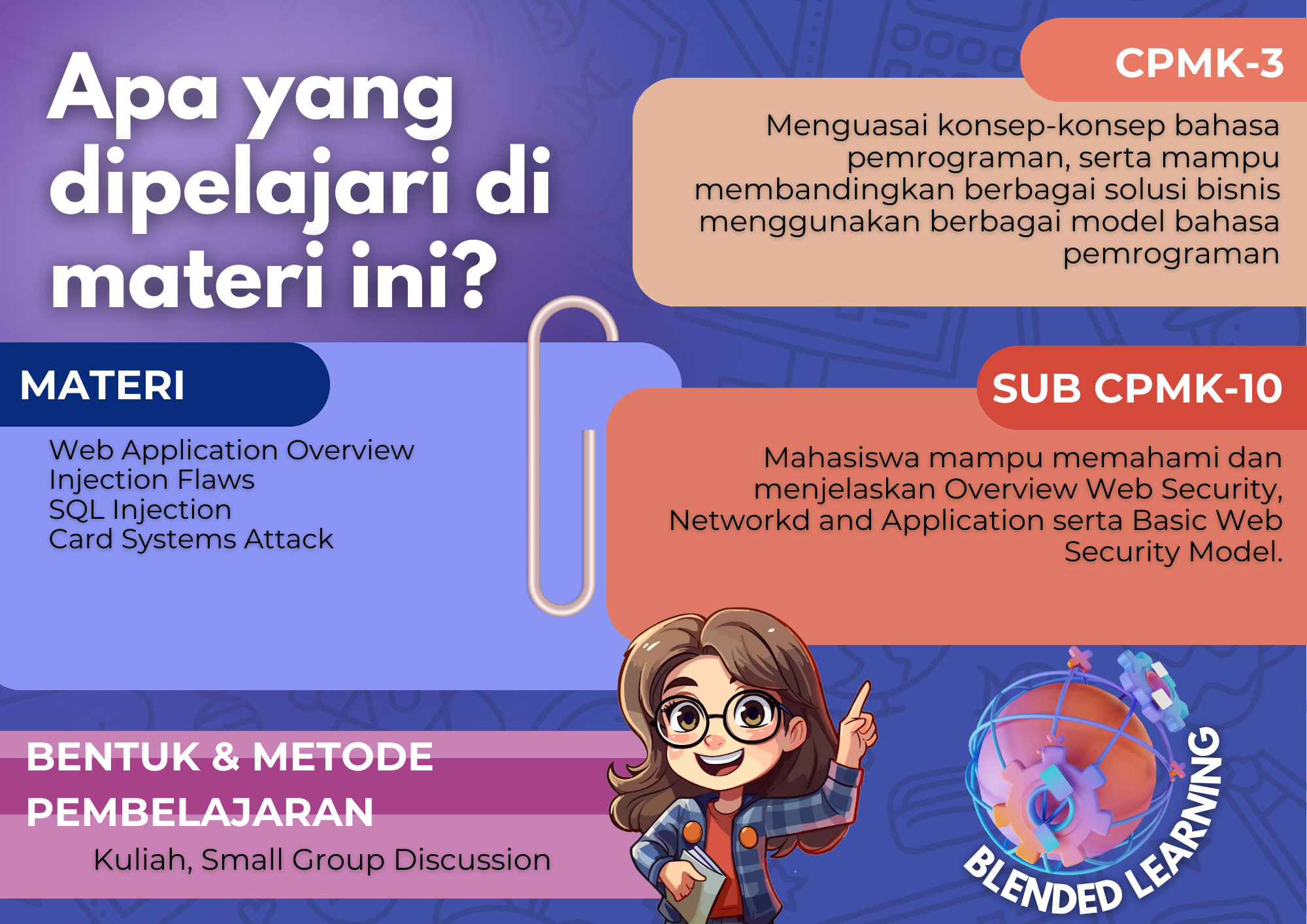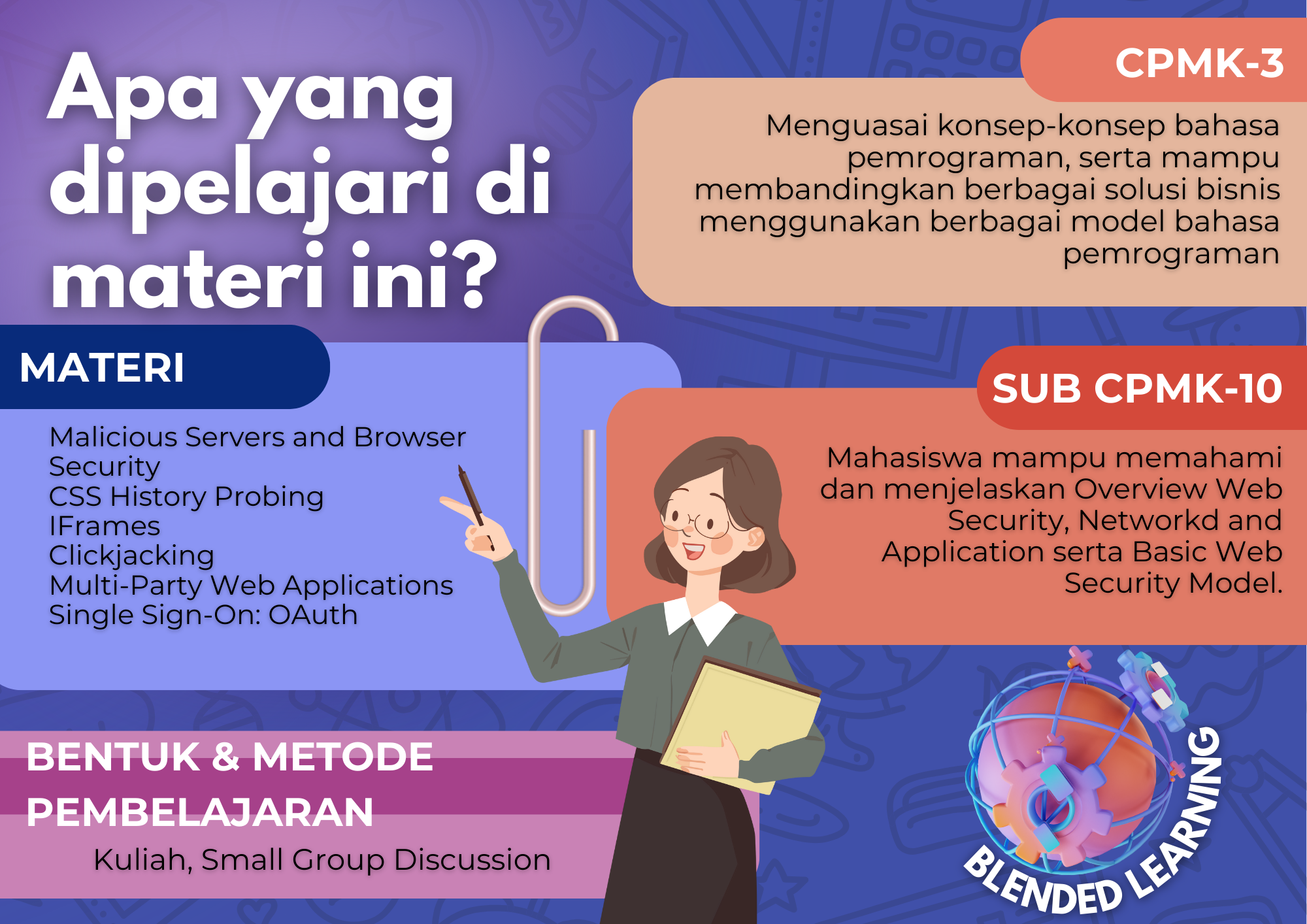 Mata kuliah ini memuat Learning Object Material (LOM) dalam bentuk slide presentasi, video animasi, dsb serta terdapat beberapa bentuk interaksi pembelajaran melalui forum diskusi, dsb yang harus diikuti oleh mahasiswa serta adanya quiz/ujian online.